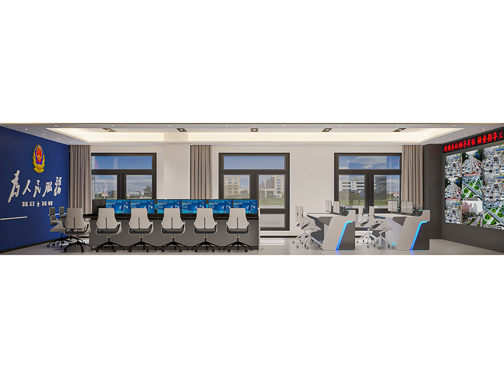 設計理念: 作為職能類辦公室裝修的標桿案例,曹縣公安局指揮中心以簡潔大氣的現代風格為主調:深藍主墻面搭配為人民服務標識,強化職能屬性;一體化操作臺 + 多屏設備適配指揮調度需求,淺灰地面與嵌入式燈光保障空間通透明亮,兼具專業性與實用性,是職能類辦公室裝修中功能優先 + 形象適配的典型呈現。
